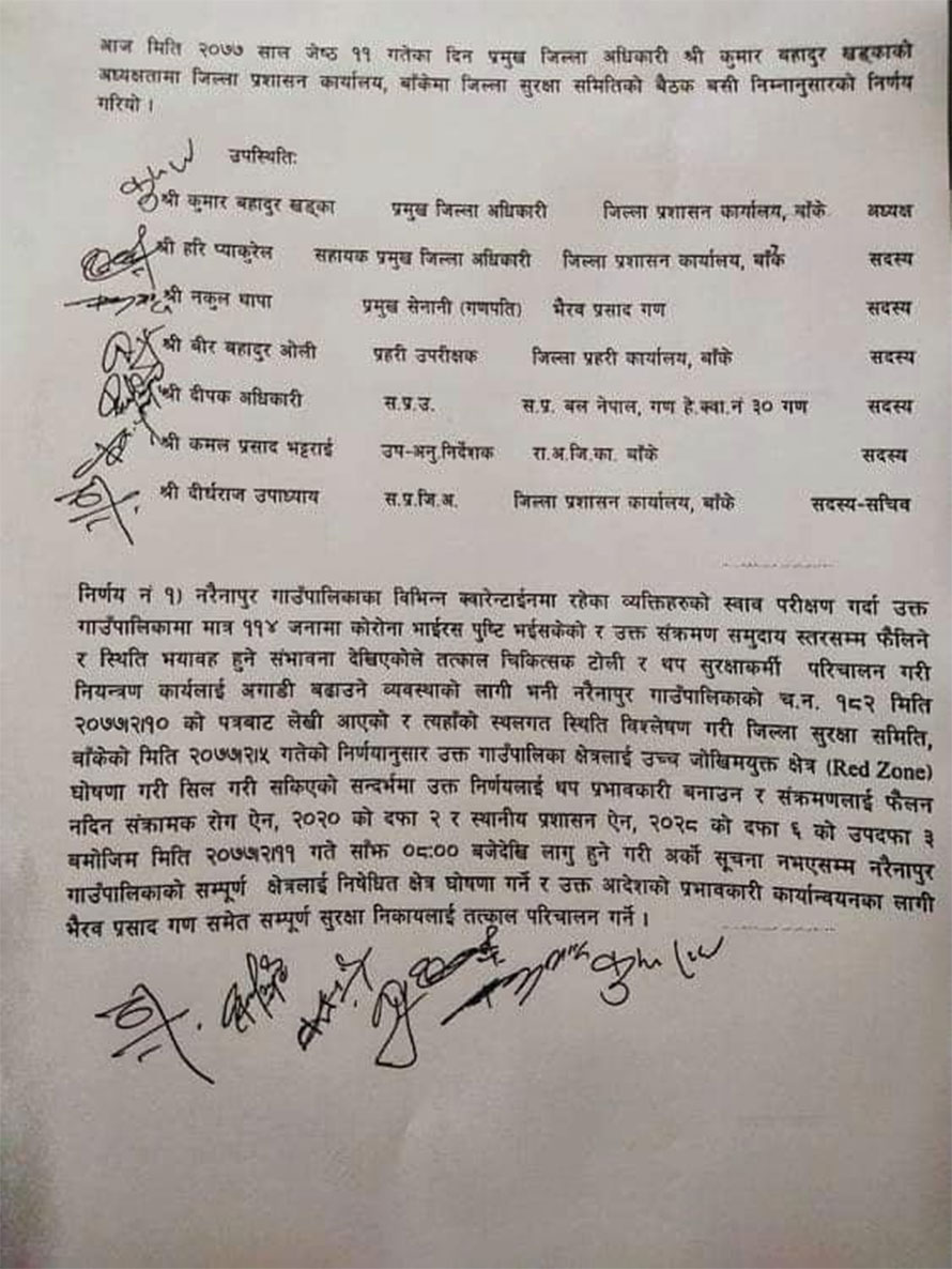 बाँकेको नरैनापुरमा कोरोना संक्रमण रोकथामका लागि निषेधाज्ञा जारी गरि सेना परिचालन गरिने भएको छ ।