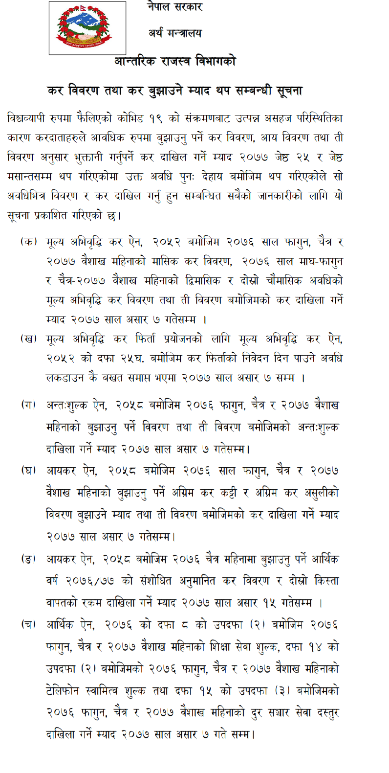 आन्तरिक राजश्व विभागले कर वुझाउने म्याद असार ७ गतेसम्म थप गरेको छ । जेठ २५ गतेभित्र कर बुझाउने नबुझाएमा जरिवाना तिर्नु पर्ने भन्दै सूचना जारी गरेको आन्तरिक राजस्व विभागले बुधबार सूचना जारी गर्दै ७ असारसम्म समय थप गरेको हो ।