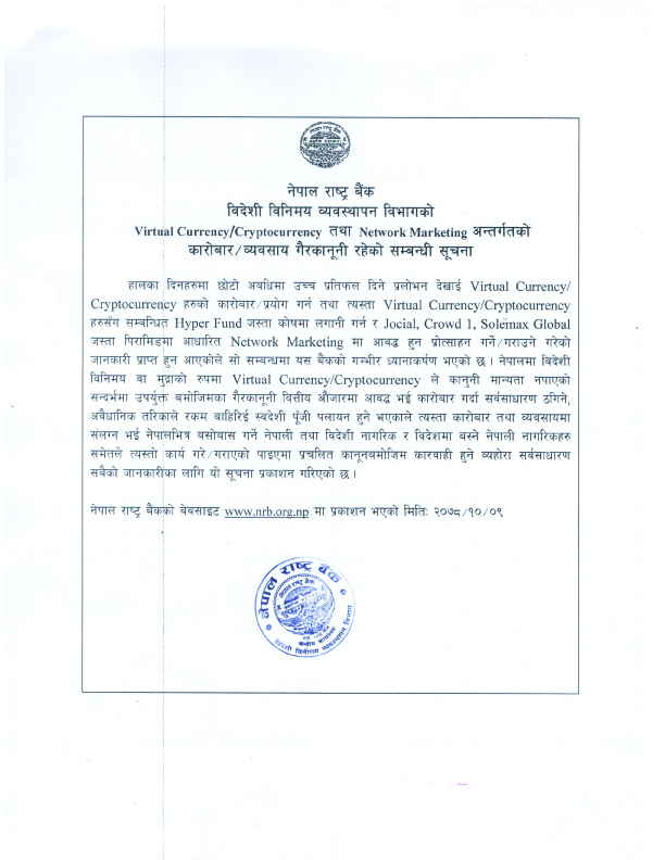 राष्ट्र बैंकले आइतबार एक सूचना जारी गर्दै नेपालमा बस्ने नेपाली वा विदेशी नागरिक र विदेशमा बस्ने नेपाली नागरिकले क्रिप्टोकरेन्सीको कारोबार गर्न नपाउने जनाएको छ ।