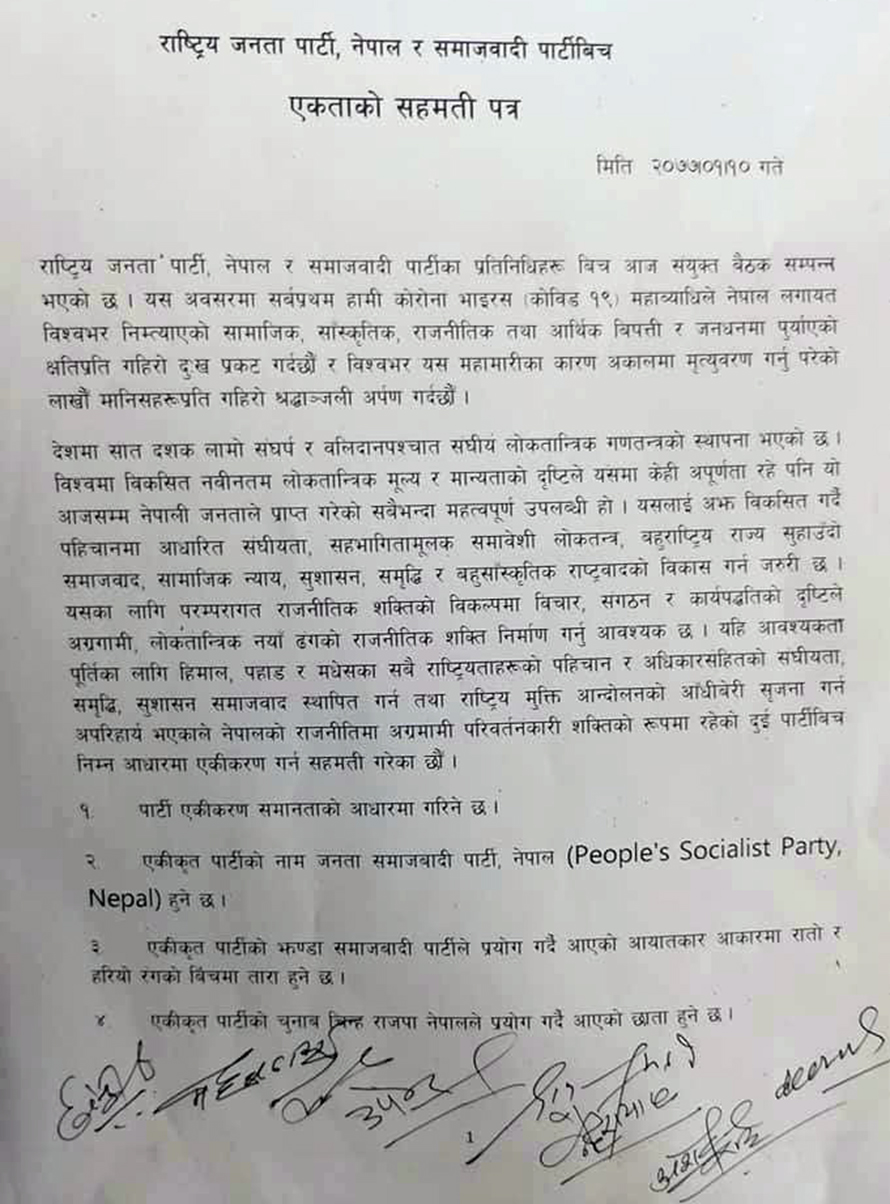 एकीकरणको सहमति पत्रमा राजपाका तर्फबाट अध्यक्ष मण्डलका सदस्य महन्थ ठाकुर, राजेन्द्र महतो, महेन्द्र राय यादव र शरतसिंह भण्डारीले हस्ताक्षर गरेका छन् भने समाजवादी पार्टीको तर्फबाट डा. बाबुराम भट्टराई, उपेन्द्र यादव, अशोक राई र राजेन्द्र श्रेष्ठले हस्ताक्षर गरेका छन् ।