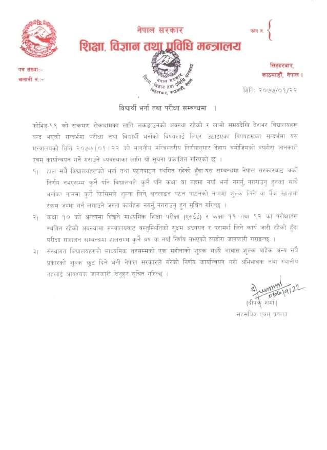 ‘हाल सबै विद्यालयको भर्ना तथा पठनपाठन स्थगित रहेको हुँदा यस सम्बन्धमा नेपाल सरकारबाट अर्को निर्णय नभएसँम्म कुनै पनि विद्यालयको कक्षा वा नयाँ भर्ना नगर्नू नगराउनुका साथै भर्ना र अनलाइन कक्षाको नाममा शुल्क नलिन सूचित गरिन्छ,’ विज्ञप्तिमा भनिएको छ ।