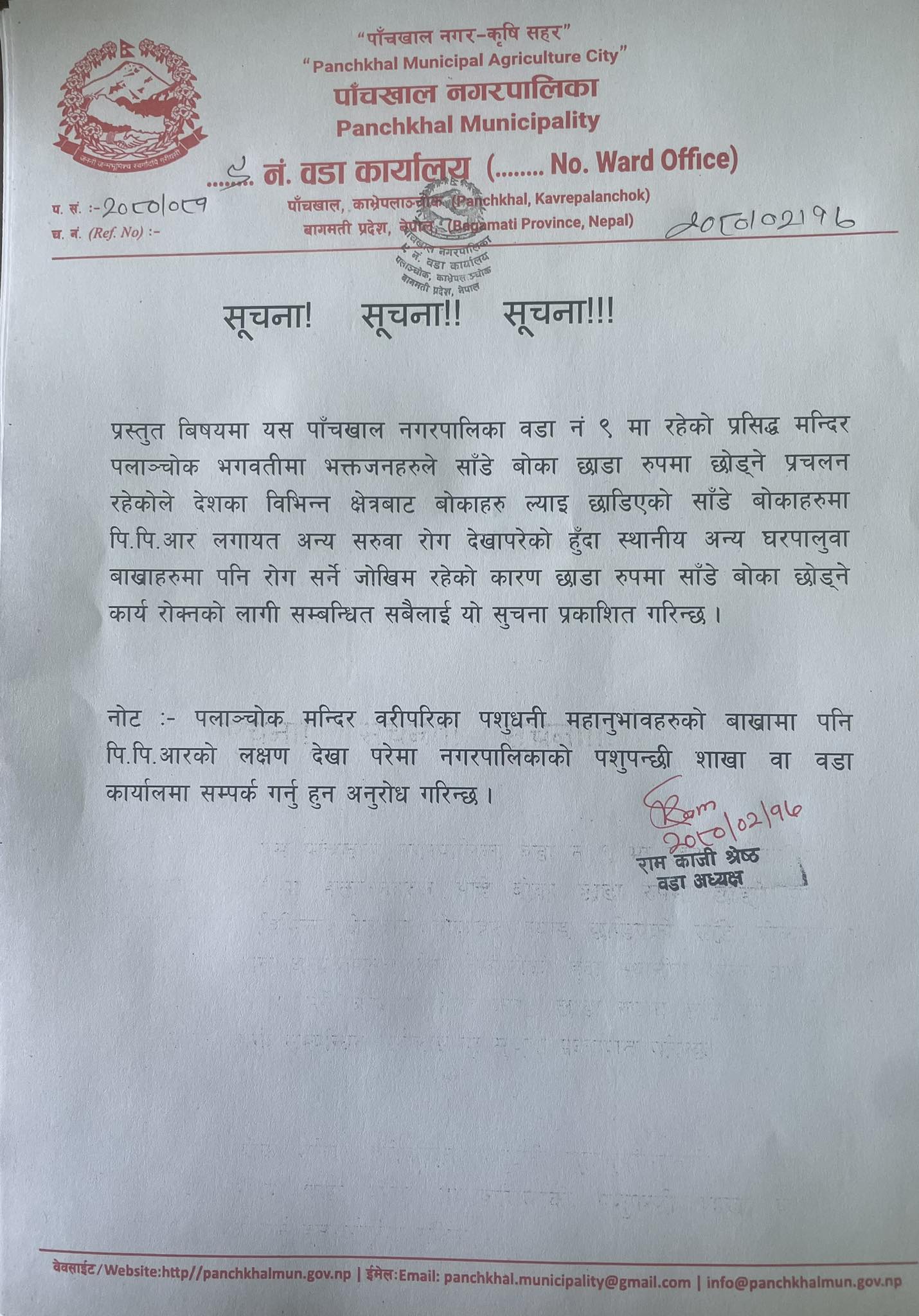 वडा कार्यालयबाट जारी गरिएको सूचनामा भनिएको छ, ‘पाँचखाल नगरपालिका वडा नं ९ मा रहेको प्रसिद्ध मन्दिर पलाञ्चोक भगवतीमा भक्तजनहरुले साँढे बोका छाडा रुपमा छोड्ने प्रचलन रहेकोले देशका विभिन्न क्षेत्रबाट बोकाहरु ल्याइ छाडिएको साँडे बोकाहरुमा पि.पि.आर लगायत अन्य सरुवा रोग देखापरेको हुँदा स्थानीय अन्य घरपालुवा बाख्राहरुमा पनि रोग सर्ने जोखिम रहेको कारण छाडा रुपमा साँडे बोका छोड्ने कार्य रोक्नको लागी सम्बन्धित सबैलाई यो सुचना प्रकाशित गरिन्छ ।’