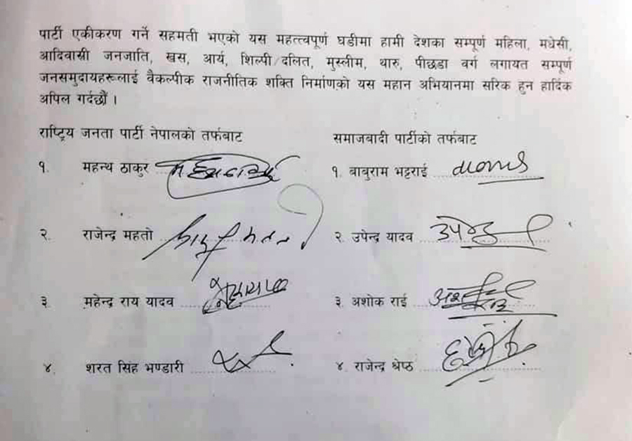 एकीकरणको सहमति पत्रमा राजपाका तर्फबाट अध्यक्ष मण्डलका सदस्य महन्थ ठाकुर, राजेन्द्र महतो, महेन्द्र राय यादव र शरतसिंह भण्डारीले हस्ताक्षर गरेका छन् भने समाजवादी पार्टीको तर्फबाट डा. बाबुराम भट्टराई, उपेन्द्र यादव, अशोक राई र राजेन्द्र श्रेष्ठले हस्ताक्षर गरेका छन् ।